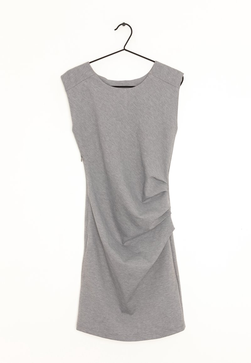 Robe grise sans manches, longueur au genou, avec col rond et fronces latérales, suspendue sur un cintre noir sur fond blanc.