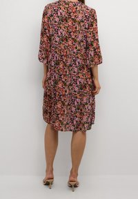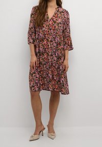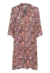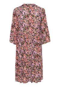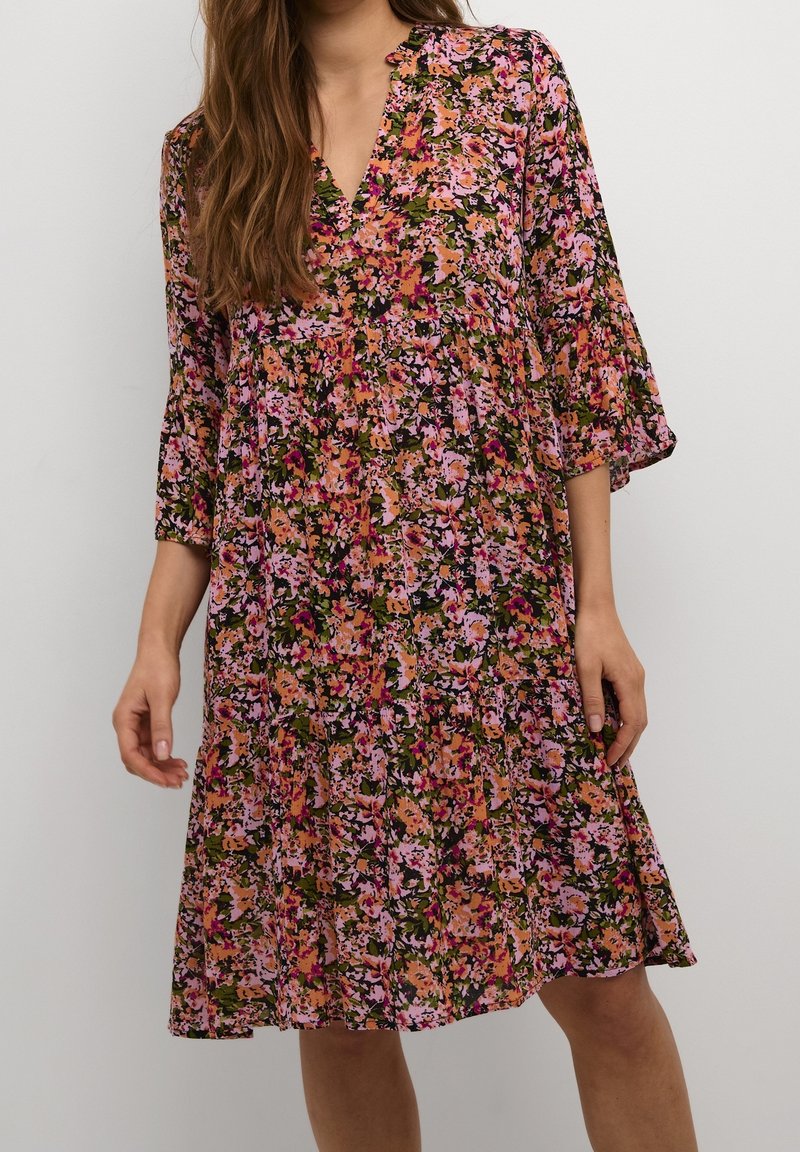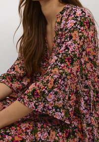 Robe fleurie avec un décolleté en V, des manches trois-quarts évasées et une coupe ample. Présente un motif floral multicolore sur fond sombre.