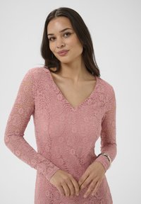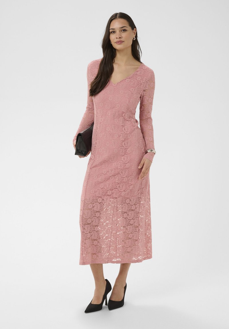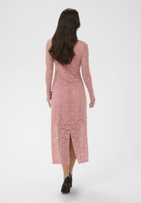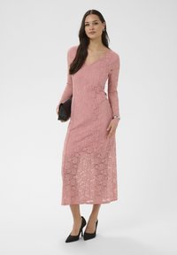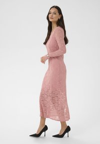 Femme portant une robe midi en dentelle rose à manches longues, des escarpins noirs, tenant une pochette noire, debout devant un fond blanc.