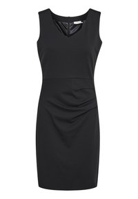 Robe sans manches noire avec un col, coupe cintrée, couture asymétrique et longueur genou, fabriquée dans un tissu lisse.