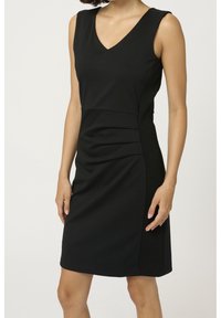 Femme portant une robe noire sans manches jusqu'aux genoux avec un col en V, debout devant un fond clair uni.