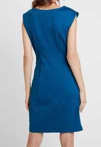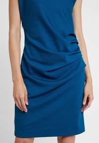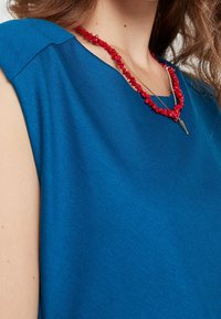 Robe-jersey bleu sarcelle à manches courtes, col rond et drapé à la taille. Portée avec un collier de perles rouges.