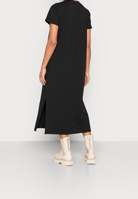 Robe noire à manches courtes et décolleté en V avec fentes latérales, associée à des bottes cheville crème à semelles épaisses et à tirants latéraux.