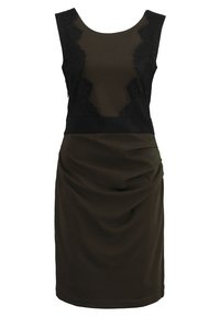 Robe olive avec une silhouette ajustée. Détails en dentelle noire aux épaules et au dos. Portée avec des sandales à talons noires. Texture lisse.