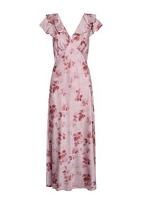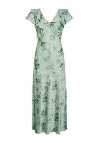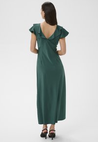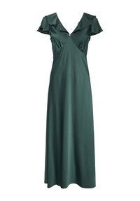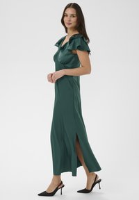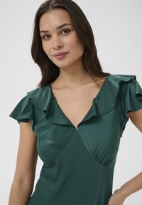 Femme en robe courte vert foncé à volants et manches courtes, tenant une pochette noire, portant des escarpins noirs à bout pointu, debout avec une main sur la hanche.