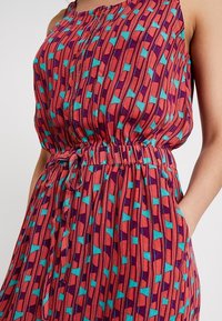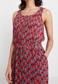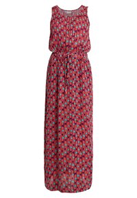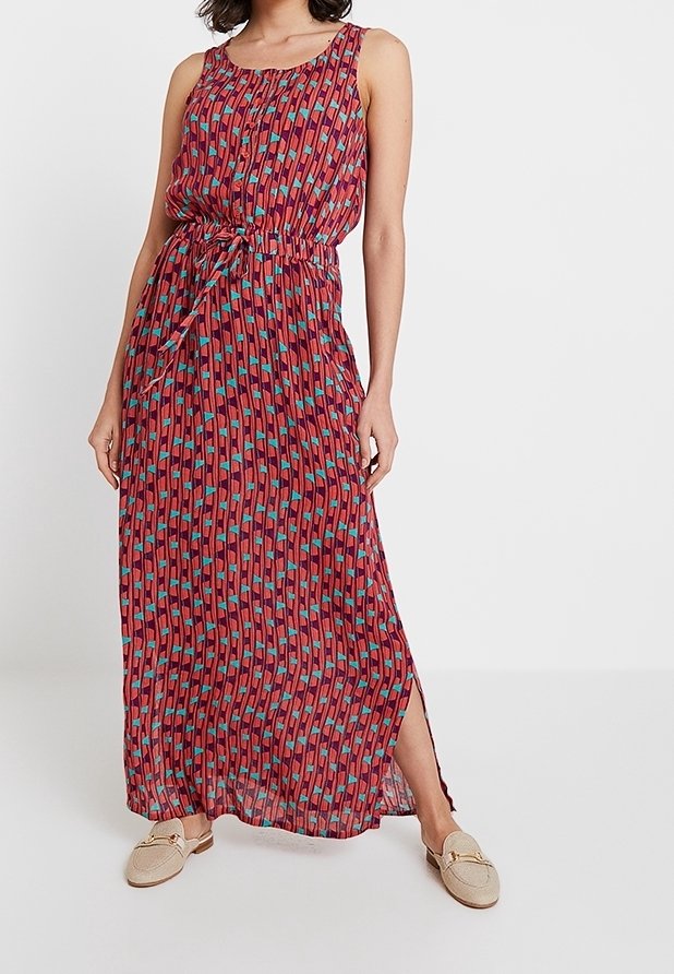 Robe maxi rouge avec des motifs géométriques en bleu et vert. Sans manches, avec une taille élastique et une fente sur le côté. Tissu léger.