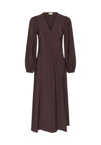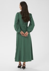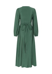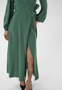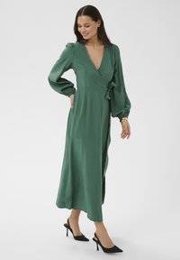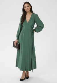 Femme debout vêtue d'une robe portefeuille verte à manches longues bouffantes, tenant une pochette noire et portant des talons pointus noirs, souriant à la caméra.