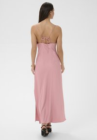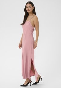 Femme aux longs cheveux bruns portant une robe longue rose sans manches, tenant un sac à main noir tressé et portant des talons noirs ainsi qu'un bracelet en or.