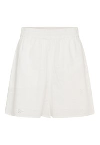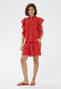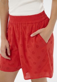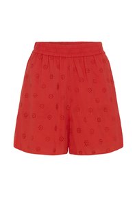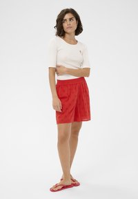 Personne portant un short rouge brodé ajouré avec une taille élastique et des tongs rouges, debout les mains dans les poches.