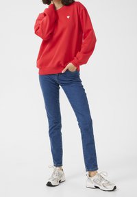 Femme portant un sweat-shirt rouge avec un petit cœur blanc sur la poitrine et un jean bleu, debout les bras légèrement fléchis.