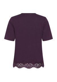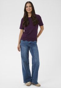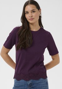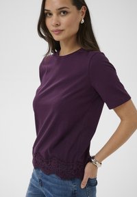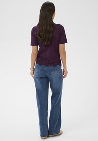 Femme aux longs cheveux bruns portant un haut violet à manches courtes avec un ourlet en dentelle et un jean bleu, debout les mains derrière le dos.