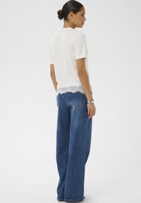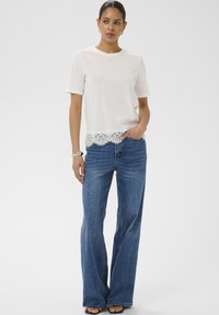 Femme aux cheveux foncés portant un haut blanc à manches courtes avec un ourlet en dentelle, un jean bleu, un bracelet argenté et de petites boucles d'oreilles anneaux, debout les mains dans les poches.