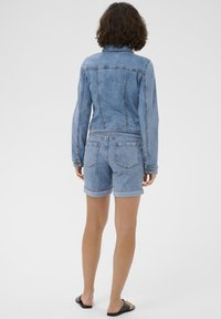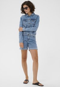 Femme aux cheveux courts et foncés portant une veste en jean bleu clair et un short assorti retroussé, debout devant un fond clair uni.