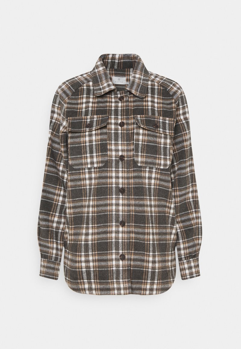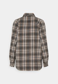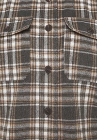 Veste-chemise à manches longues à carreaux marron, blanc et gris, fermeture boutonnée sur le devant, et deux poches poitrine à rabat avec boutons.