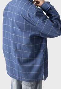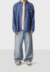 Homme portant une chemise à carreaux bleue boutonnée par-dessus un t-shirt rose clair avec un jean bleu clair, les mains dans les poches, et un collier de perles.