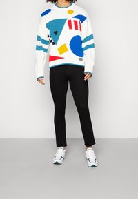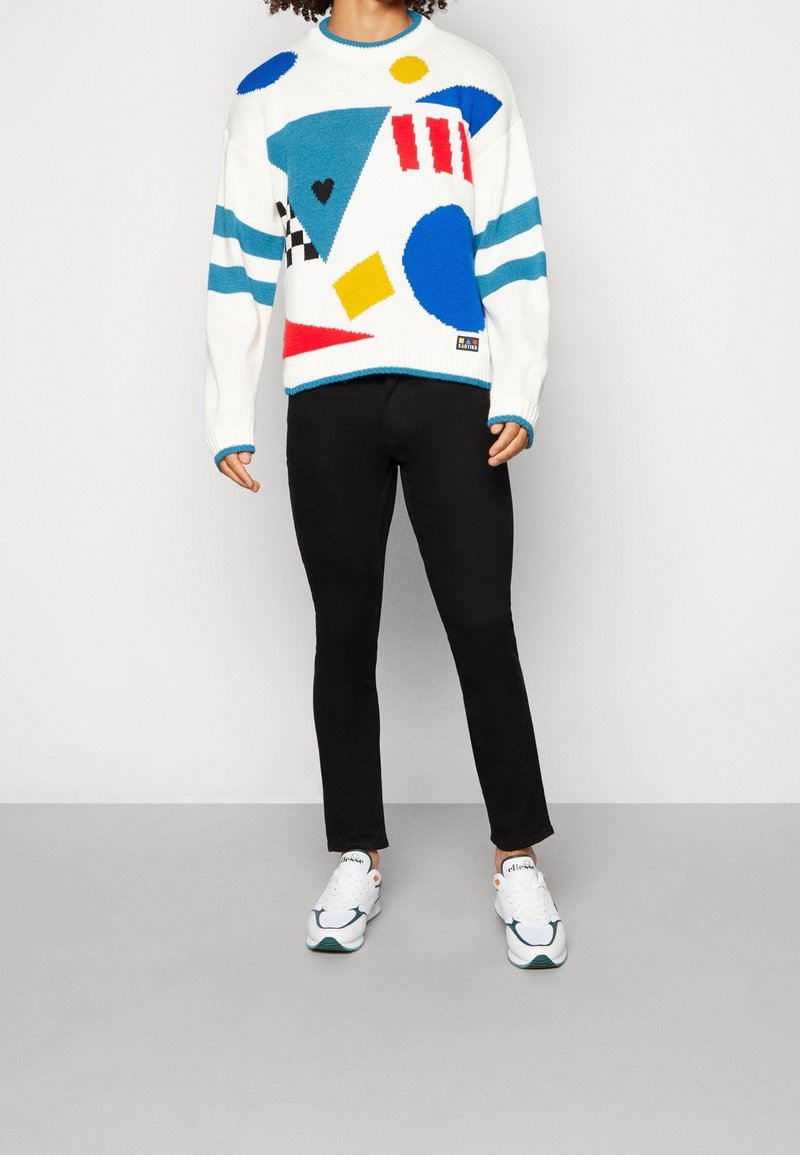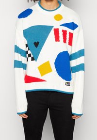 Personne portant un pull blanc avec des formes géométriques colorées, un pantalon noir et des baskets blanches, posant devant un fond uni.