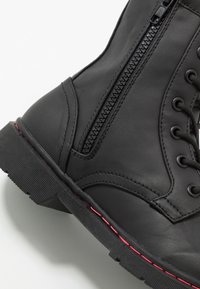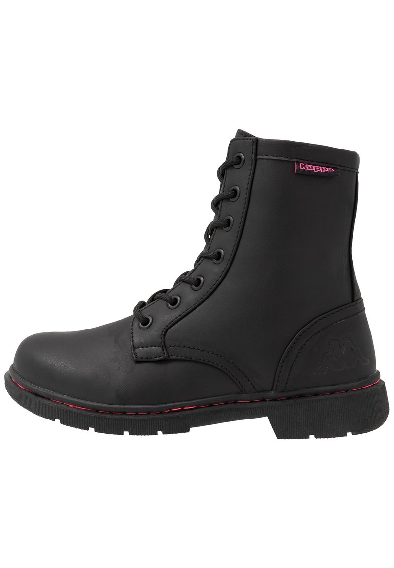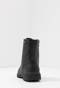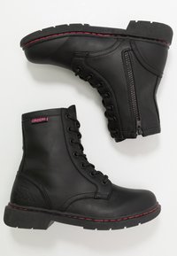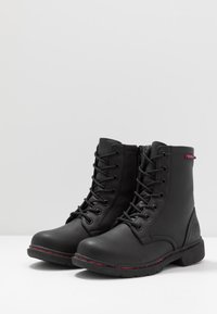 Bottine noire à lacets en cuir synthétique, avec des surpiqûres rouges, une semelle plate et un logo embossé sur le côté extérieur.
