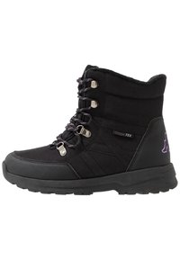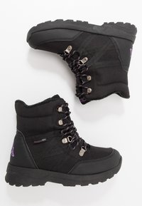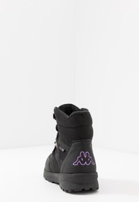 Botte d'hiver noire isolée avec haute cheville, lacets sur le devant, œillets métalliques, semelle texturée et petite étiquette en tissu "Kappa TEX" sur le côté.