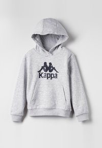Sweat à capuche gris clair avec poche avant, présentant un logo noir Kappa composé de deux silhouettes assises dos à dos et le nom de la marque en dessous.