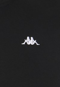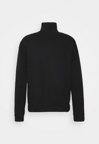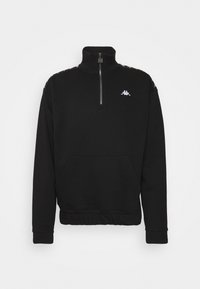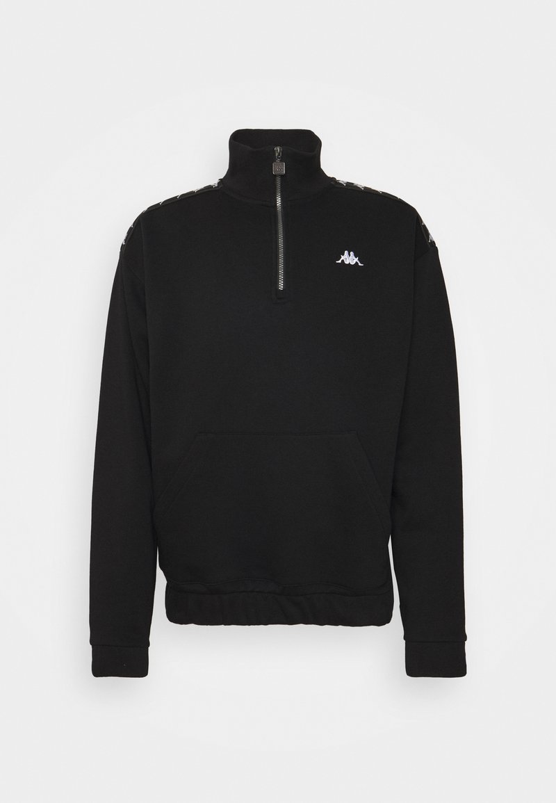 Sweat-shirt noir à fermeture quart de zip avec logo blanc sur la poitrine gauche et bande à motifs le long des épaules et des manches, poche kangourou avant.