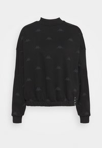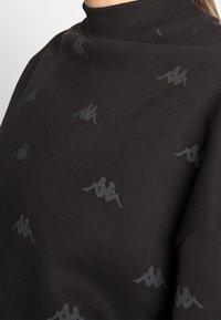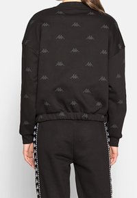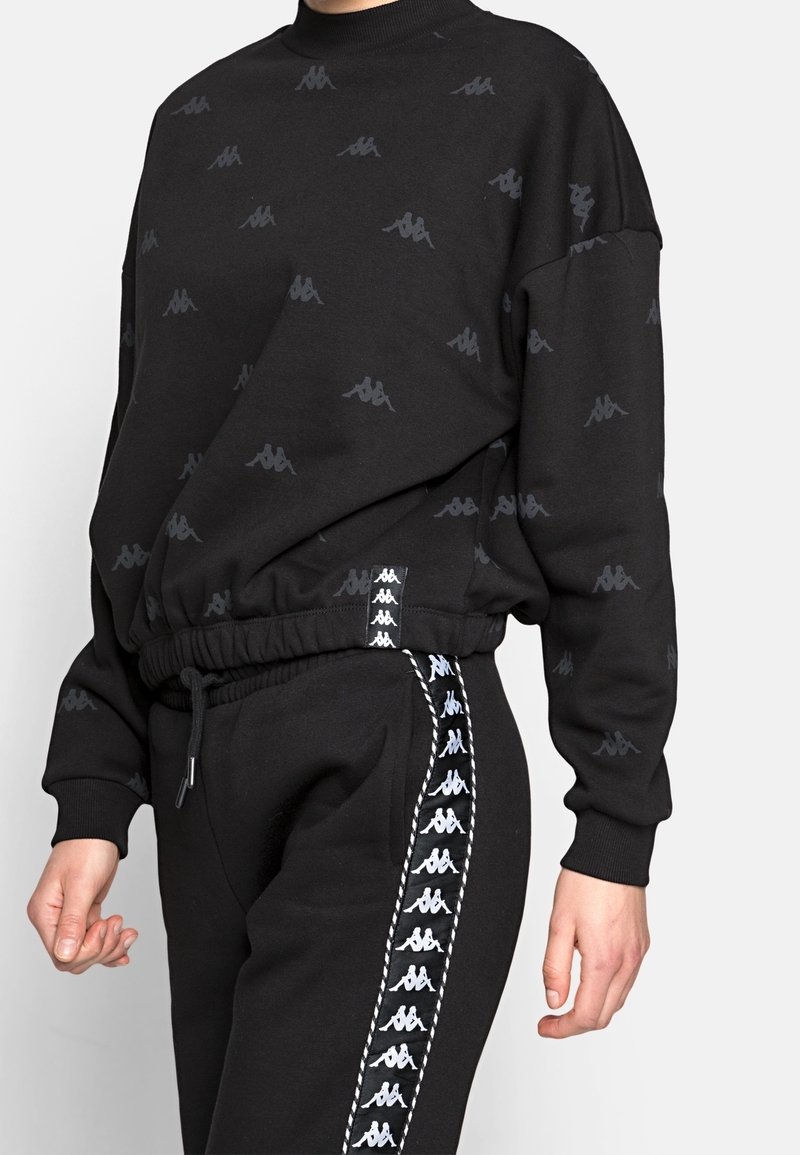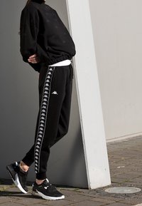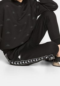 Personne portant un sweat-shirt noir et un pantalon ornés de logos blancs répétés sur les manches, la poitrine et les côtés du pantalon, debout devant un fond uni.