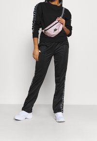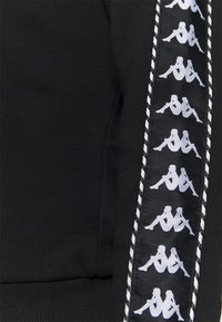 Personne portant un survêtement Kappa noir avec des bandes blanches de logo courant le long des manches et du pantalon, debout devant un fond uni.