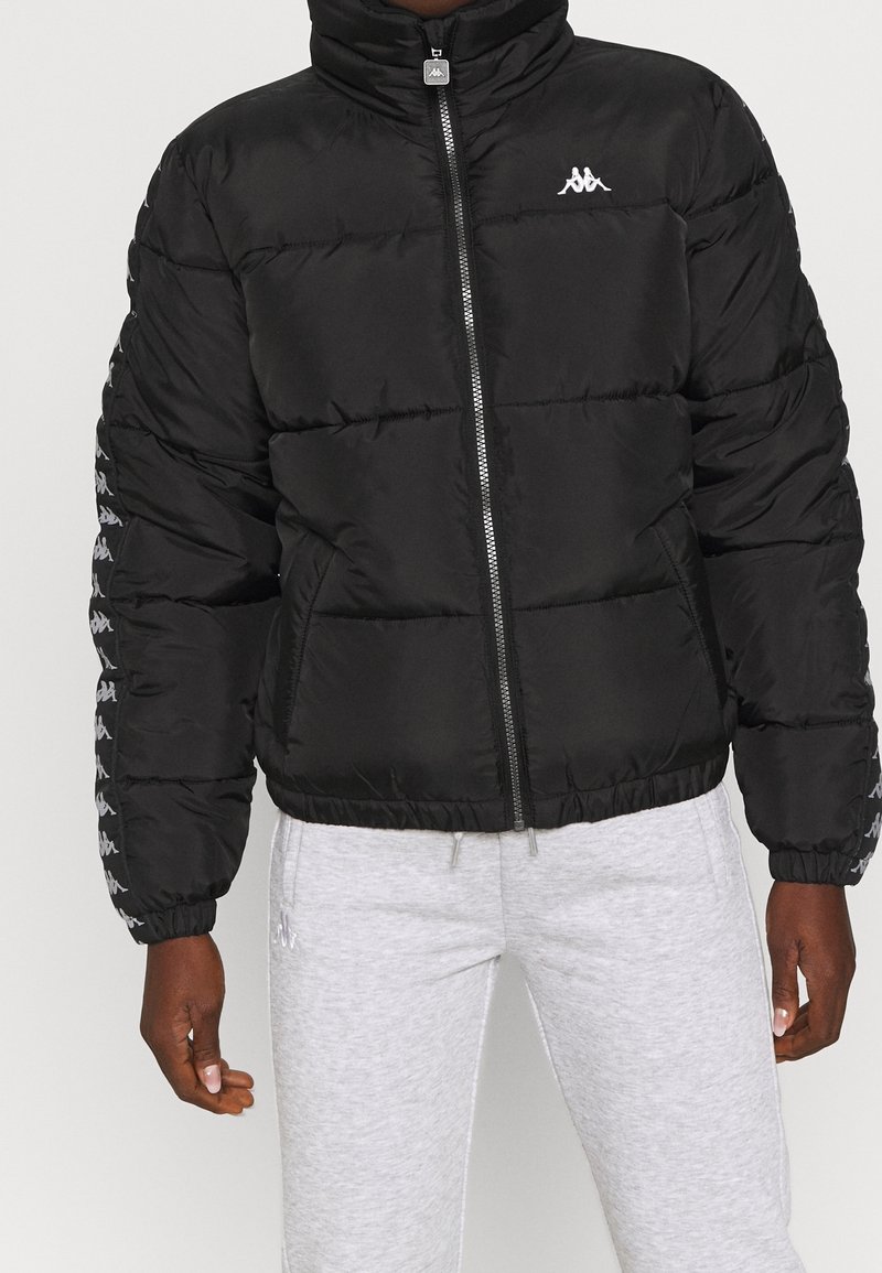 Veste matelassée noire avec col montant, conception rembourrée et fermeture éclair. Comprend deux poches avant et un logo blanc brodé sur la poitrine.