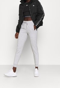 Personne portant une doudoune noire avec un logo blanc sur la poitrine et le long des manches, associée à un pantalon de survêtement gris clair.