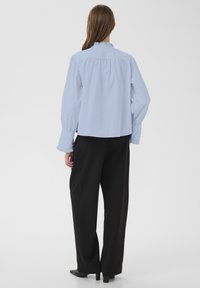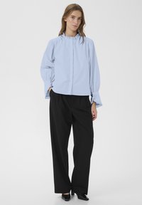 Femme portant un chemisier bleu clair à manches longues avec col et poignets à volants, associé à un pantalon noir ample, debout devant un fond uni.