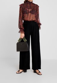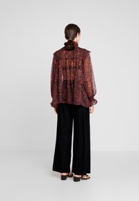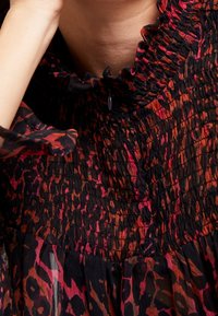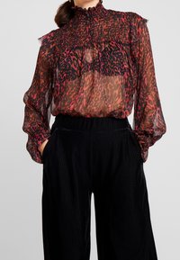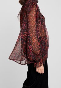 Blouse transparente à imprimé léopard rouge et noir avec col montant à volants et manches bouffantes, associée à un pantalon en velours côtelé noir.