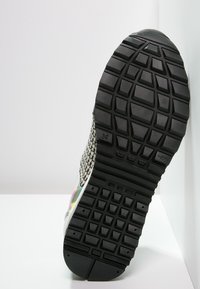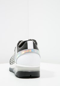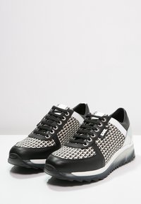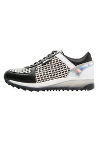 Baskets à motif noir et blanc avec un accent brillant et irisé. Dotées d'un design avec lacets noirs et d'une semelle texturée pour une meilleure adhérence.