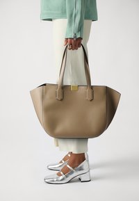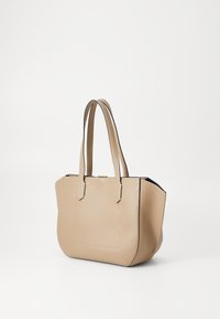 Sac cabas en cuir beige avec doubles bretelles et détail de poche rectangulaire cousue sur un fond uni.