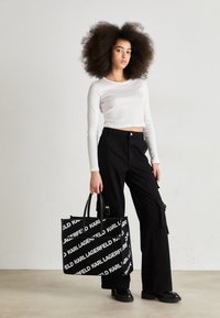 Sac cabas noir avec un motif de texte diagonal blanc « KARL LAGERFELD » et deux poignées noires, sur fond blanc uni.