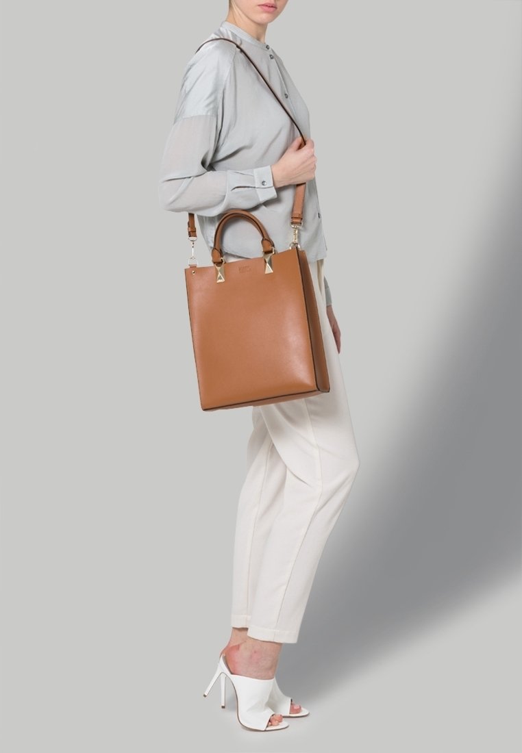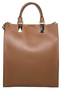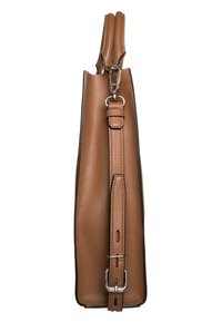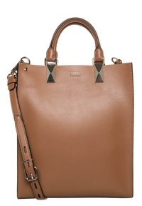 Sac fourre-tout en cuir marron avec deux poignées supérieures et une bandoulière amovible, présentant une forme structurée et des accents en métal doré.