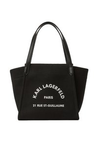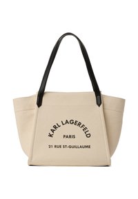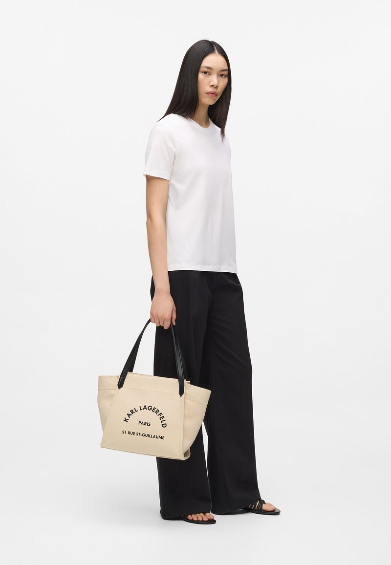 Femme debout portant un t-shirt blanc, un pantalon large noir, des sandales noires, tenant un sac cabas beige Karl Lagerfeld avec des poignées noires.