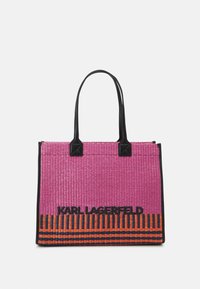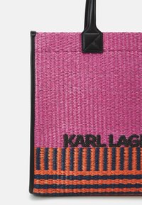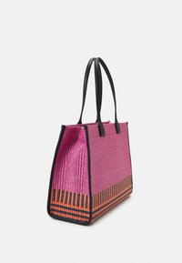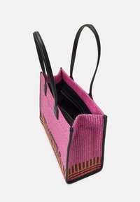 Sac fourre-tout tissé rose avec des accents et des poignées en cuir noir. Présente le logo de la marque avec des détails rayés noirs et oranges en bas.