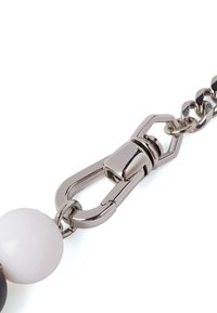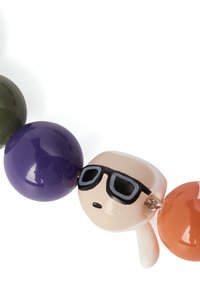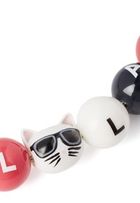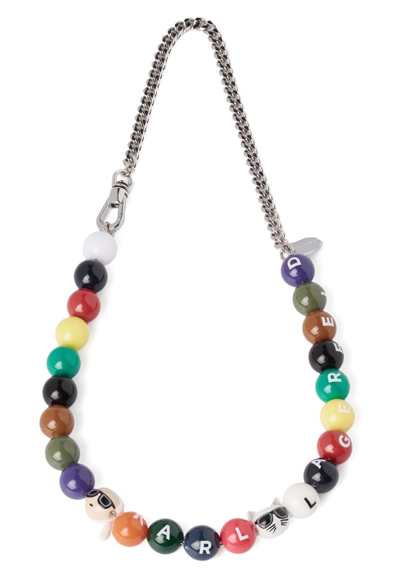Collier chaîne en argent avec des perles rondes multicolores formant le nom "KARL LAGERFELD" et deux perles représentant des personnages portant des lunettes de soleil.