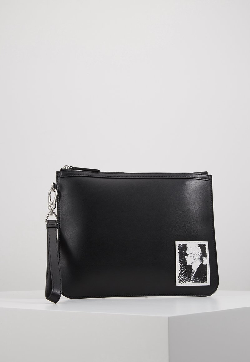 Pochette rectangulaire en cuir noir avec bracelet pour poignet et petite pièce blanche affichant un croquis en noir et blanc d'une personne de profil.
