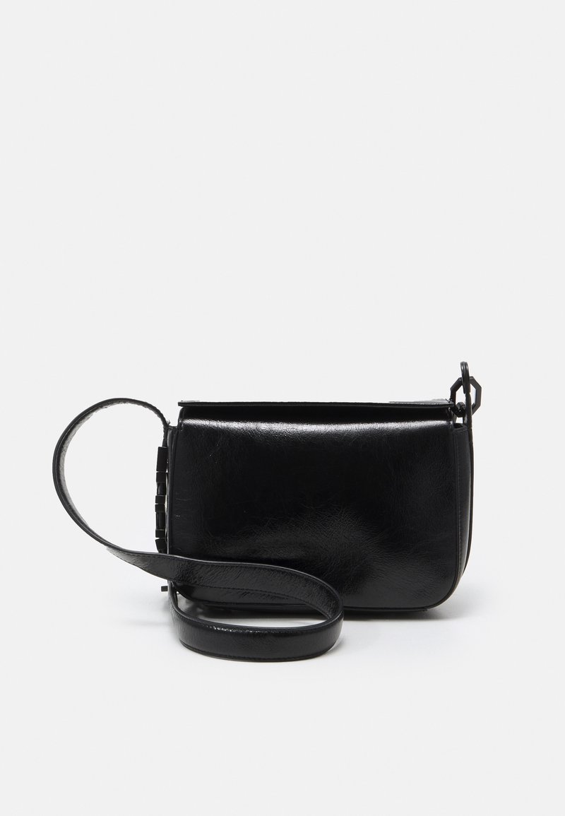 Sac en cuir noir en bandoulière, forme rectangulaire, texture lisse, sangle ajustable, fermeture éclair, design minimaliste, sans accents matériels visibles.
