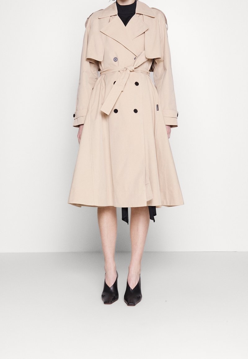 Manteau trench-coat beige à double boutonnage avec ceinture nouée, col large et boutons, porté avec des chaussures noires à bouts pointus sur un fond uni.
