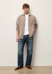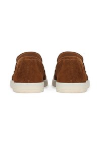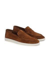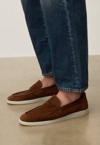 Mocassins marron en daim à enfiler avec semelles blanches portés avec un jean en denim bleu sur un sol beige.