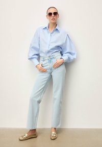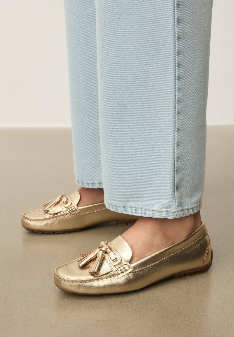 Pieds portant des mocassins à pampilles métalliques dorés associés à un jean droit bleu clair, debout sur un sol lisse.