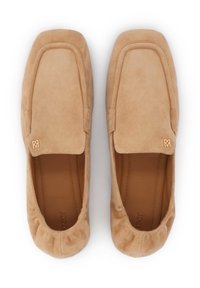 Mocassin en daim marron clair avec semelle basse noire, élastique à l'arrière et petit logo de marque en or près du bord supérieur, vue latérale.