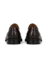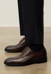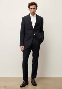 Homme portant un costume bleu marine ajusté avec une chemise blanche et des chaussures en cuir marron, debout avec une main dans la poche.