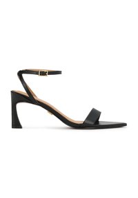 Sandales à talons hauts en cuir noir avec un design à lanières, une sangle à la cheville, un accent de boucle et une ouverture au niveau des orteils, présentant une semelle intérieure texturée.