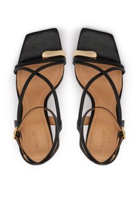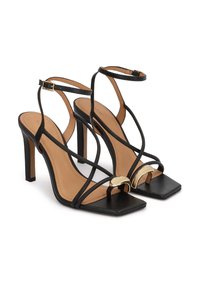 Pieds portant des sandales à talons hauts noires à brides, ornées d'accents décoratifs dorés sur les orteils et de bracelets à boucle autour de la cheville, posés sur une surface lisse.