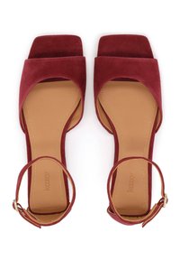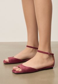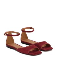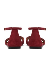 Pieds portant des sandales plates à bout ouvert en daim bordeaux avec des fines lanières chevillées et de petites boucles dorées, debout sur un sol lisse.