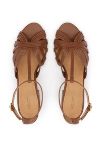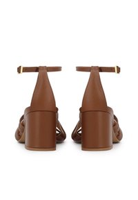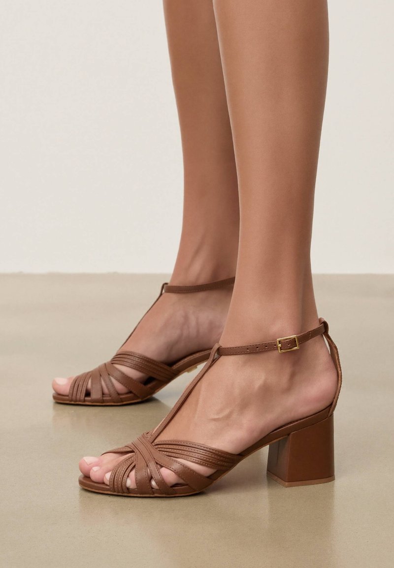 Pieds portant des sandales en cuir marron à bout ouvert, avec des brides autour de la cheville et des petits talons carrés, sur un sol beige lisse.