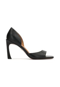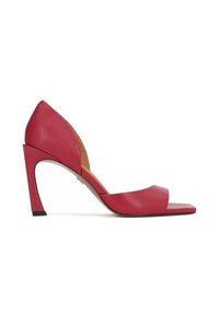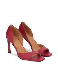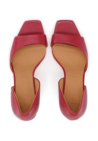 Jambes portant des sandales à talons roses avec un bout carré et des sangles simples sur les orteils et autour du talon, debout sur un sol lisse.