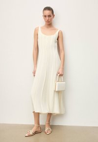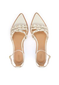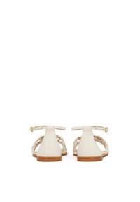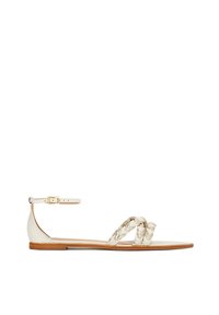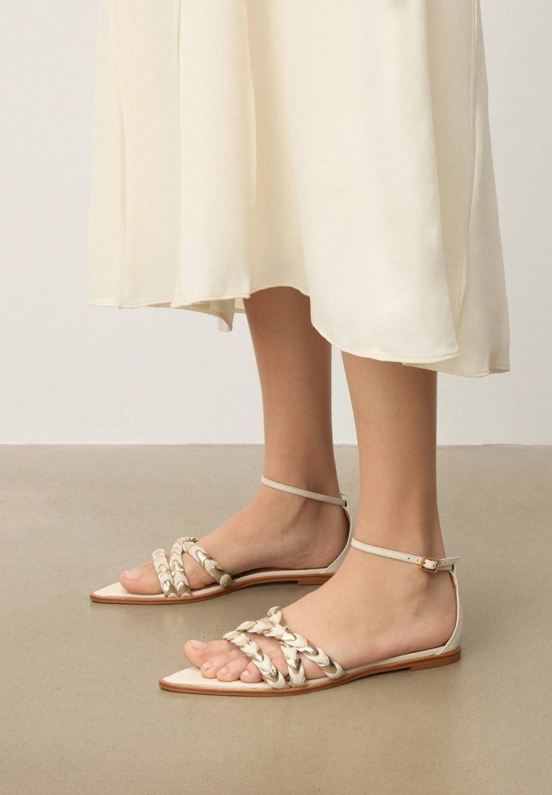 Pieds chaussés de sandales plates de couleur crème avec des brides tressées et des boucles à la cheville, assorties à une robe midi ivoire fluide.